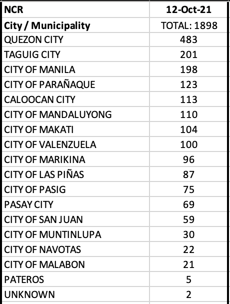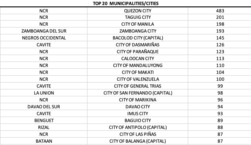 On an LGU level, 10 of 17 LGUs in NCR were among the top 20 cities/municipalities with most cases. The others in the list included Zamboanga City, Bacolod City, and Dasmariñas (Cavite) in the top ten.