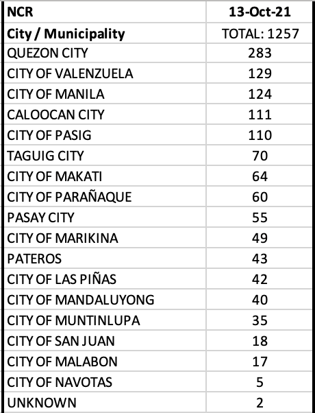 The Health Agency announces 7,181 new cases today, with 40,323 tested last October 11 yielding 14.2% positivity. While we are not testing enough (positivity rate is still high but is going down), the downward inflection in cases is reflected in the healthcare utilization both nationally and in the NCR, where ICU utilization rate is at moderate risk.