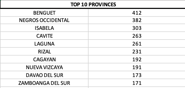 Benguet topped today’s list for provinces with most cases, followed by Negros Occidental and Isabela.