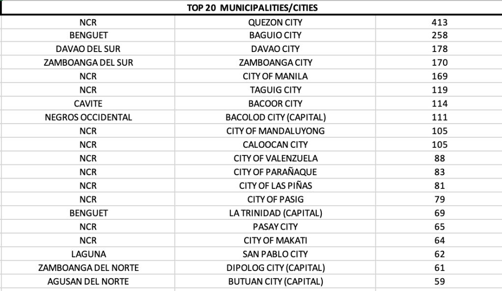Five cities in the top ten were from NCR, while the other five were from major LGUs outside of Mega Manila. Those outside of NCR were: Baguio, Davao City, Zamboanga City, Bacoor (Cavite) and Bacolod City.