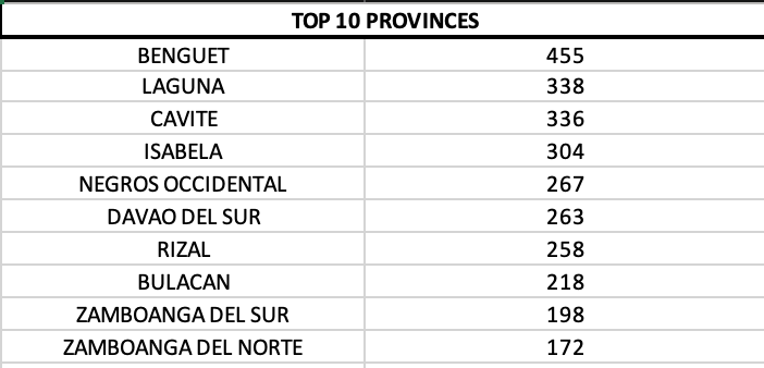 On a provincial level, Benguet continued to lead among the top ten.