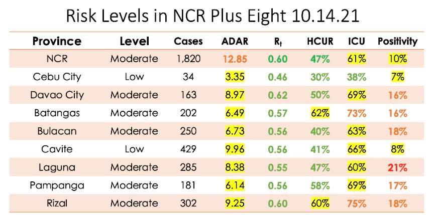 Based on the OCTA Research data, six of these areas are now at moderate risk, while two – Cebu City and Cavite – are at low risk. This is based on the average values for the indicators of ADAR (incidence rate), Rt (reproduction number), health care utilization (HCUR and ICU utilization rate) and positivity of tests.