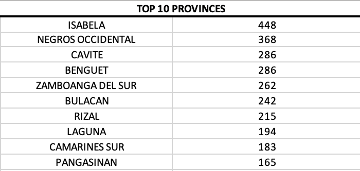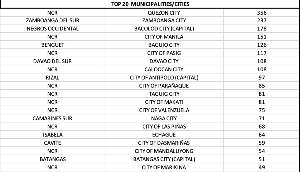 On an LGU level, only 8 LGUs reported triple digits while the remaining 12 reported double digits. The LGU in 20th spot, the City of Marikina, had 49 cases. Eleven of 17 LGUs in NCR are among the top 20 cities/municipalities with most cases. Five LGUs outside of NCR are in the top ten – Zamboanga City, Bacolod City, Baguio City, Davao City and Antipolo (Rizal).