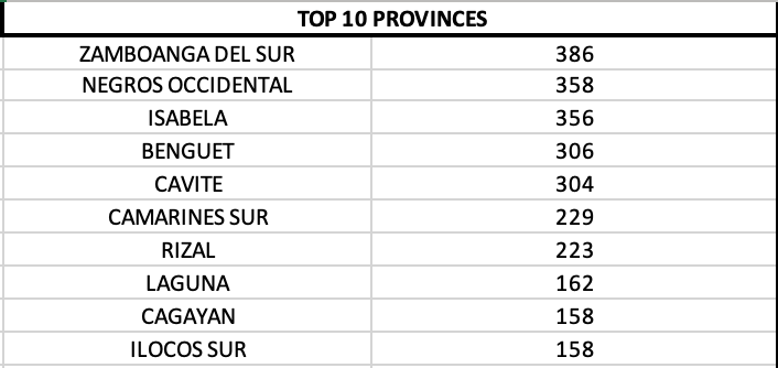 The regional data is reflected in the provincial data where one case see that the cases are mostly seen in Zamboanga del Sur, which made it to the top spot today.
