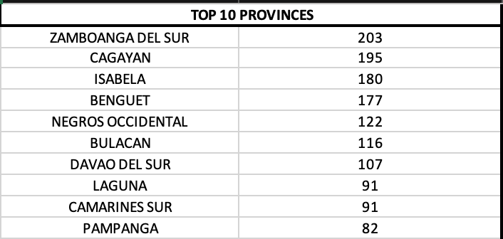Zamboanga del Sur continued to top the provinces, with Cagayan, Isabela and Benguet in 2nd – 4th ranks.