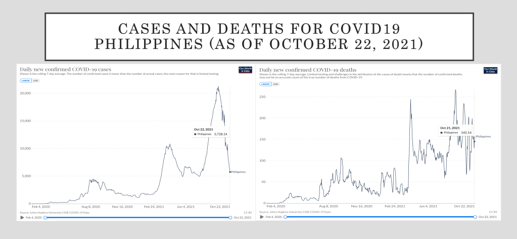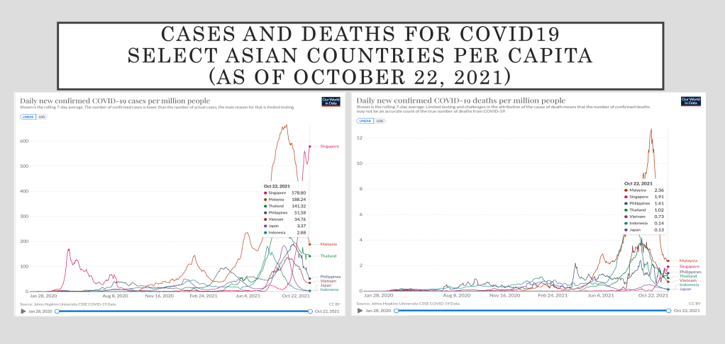 Among select Asian countries, the Philippines slipped to third place with a 7-day average down to 5,700 as of October 22. Enviably are Indonesia and Japan that are enjoying all time lows with triple digits. Indonesia recorded a 7-day average of around 800 daily cases, while Japan is below the 500 mark.