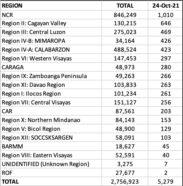 NCR accounted for 19% of today’s total cases with 1,010 new cases. Its third straight day also of recording four digits. Cagayan Valley is in second spot, while Central Luzon in third. Except for BARMM and Eastern Visayas, all regions recorded triple digit cases.
