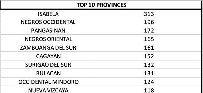 On a provincial level, Isabela continued to lead. Pangasinan, Nueva Vizcaya and Cagayan are the provinces in Northern Luzon that are among the top 10 with most cases.