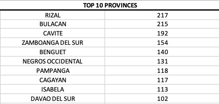 On a provincial level, Rizal took the lead, followed by Bulacan and Cavite.