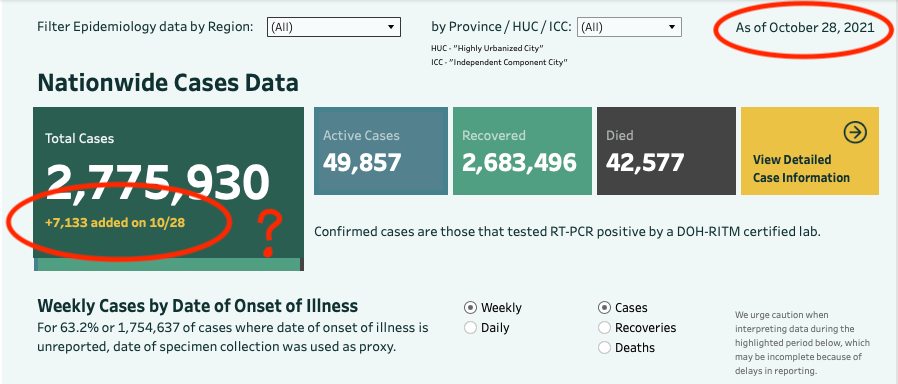 With the announcement of adjustments of backlog cases, additional 3,439 new cases from September 29 to October 18 and added only to COVIDKAYA on October 27, puts the total of cases to 7,133 for October 28, 2021