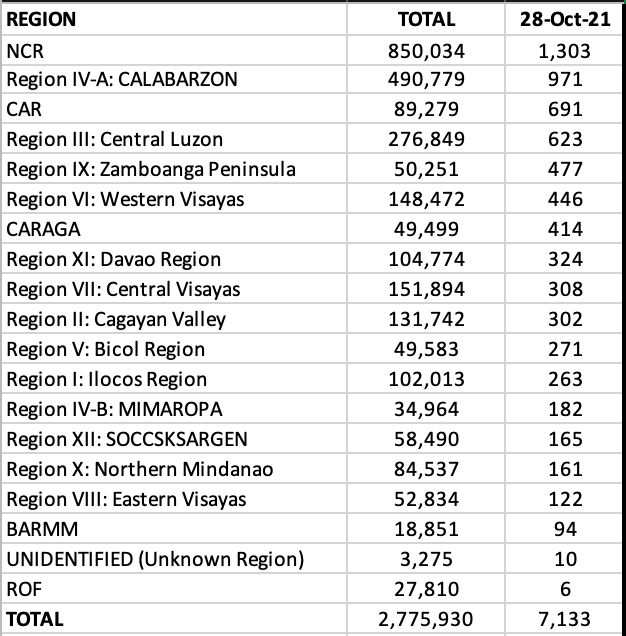 Officially, the Philippines reported 7,133 newly announced cases on October 28. Most of the cases added are considered recovered while only 22 remained active. Two deaths were reported from this ‘second’ report.