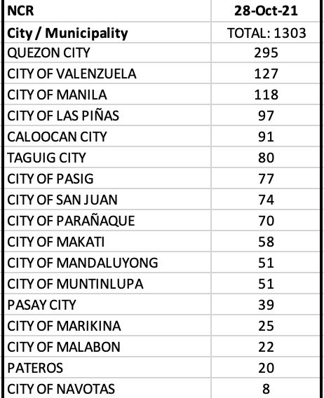For completeness, NCR continued to lead with 1,303 or 18.2% of the cumulative total cases for yesterday and the late report today. CALABARZON was in second, while CAR came in third.