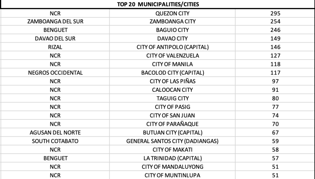 Quezon City continued to be the LGU to beat on a city/municipality level, but was the only LGU in the NCR in the top 5. The other LGUs in the top five were: Zamboanga City, Baguio City, Davao City and Antipolo City (2nd to fifth spot in that order).