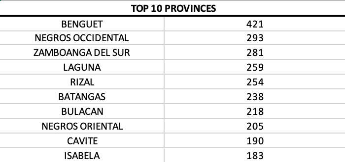 On a provincial level, Benguet took the lead, but several provinces in the CALABARZON region were in the top ten, including Laguna, Rizal, Batangas and Cavite.