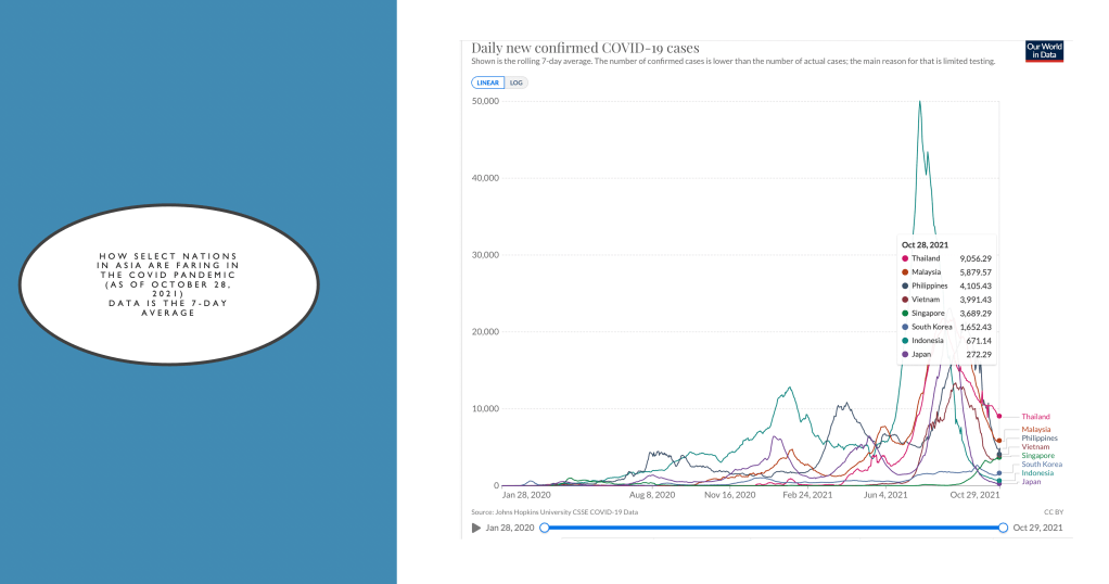 A quick look at our ASEAN neighbors show that as of October 28, Thailand continued to lead among ASEAN nations in the 7-day average of cases per day. Indonesia and Japan continue its triple digit numbers with Japan reporting less than 300 daily cases. This is, however, not corrected based on population size.