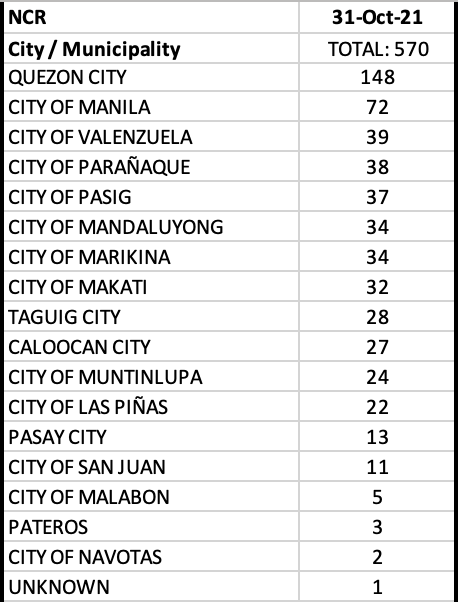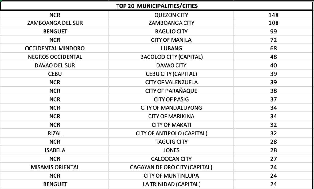 Striking is that among the top 10 LGUs with most cases, six LGUs outside of NCR are in the list, They include: Zamboanga City, Baguio City, Lubang, Bacolod City, Davao City and Cebu City.