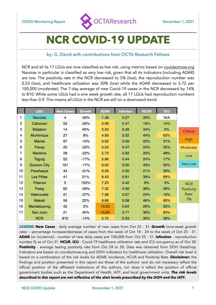 Navotas is the only LGU that has markedly improved in terms of cases, ADAR and R. Notice that it is the only LGU of 17 LGUs in NCR that is at very low risk with 1.48 cases/100,000 population and a R of 0.27.