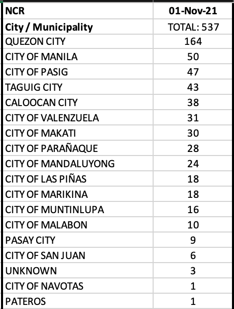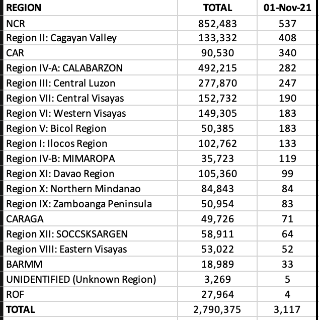 This week is a new beginning. Will we see better data for the month of November in the NCR? We need to sustain the momentum. That means, and I’ve been saying this already, is to keep the R at <0.5. Keeping above this just does not cut it. Because it is the major economic hub and the epicenter for cases in the country due to its density (highest number of people by region in terms of land area), my personal opinion is that the only way it should be allowed to move to a lower alert level from the current level 3 is if it keeps R <0.5 for 2 consecutive weeks or account for only 10% of the total cases in the country for 2 consecutive weeks.