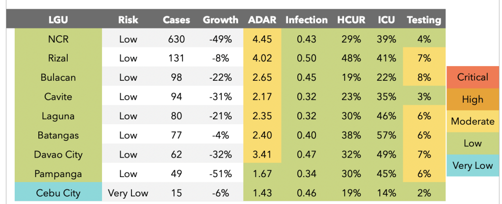 As of November 2, all the LGUs are now considered low risk, with Cebu City achieving excellent work at sustaining their very low risk category as cases there continue to decrease further and has the lowest positivity tests among the nine highest risk LGUs at 2%. Their ICU and health care utilization is also less than 20%.