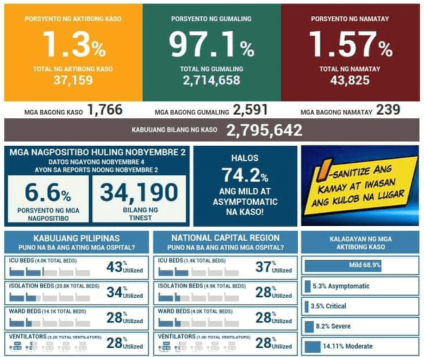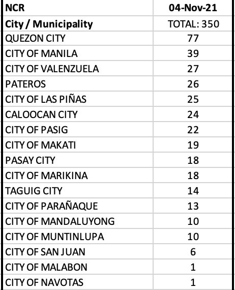 It was obviously going to be higher today, as more tests were done on November 2. The positivity rate was at 6.6%, which is still quite a decent number considering that testing has been lower particularly in areas outside of NCR plus eight (see the data below).