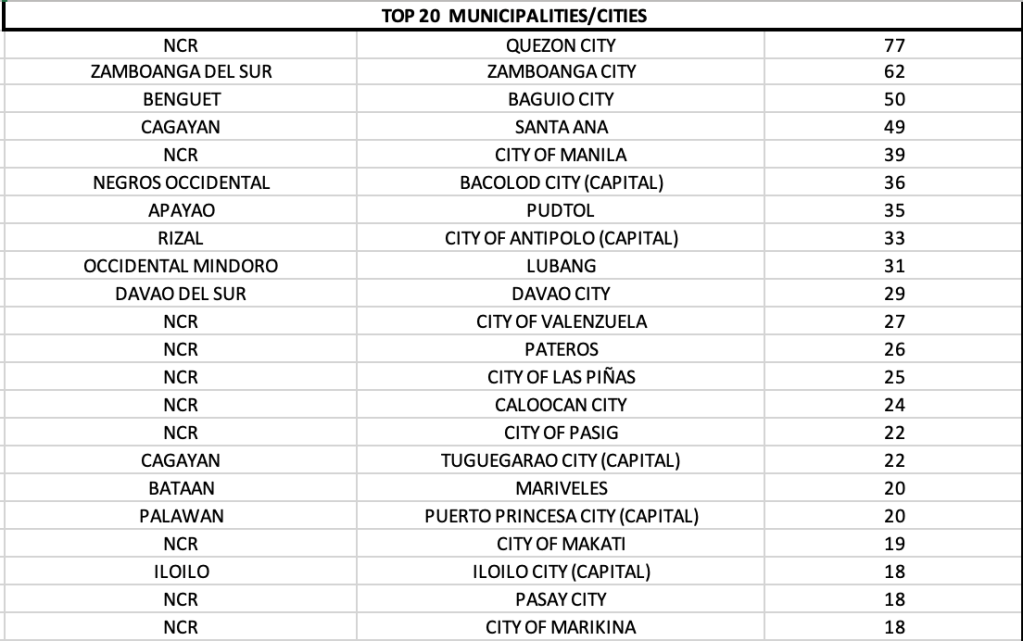 Among the top 10 LGUs, however, only 2 were from NCR. The rest were from cities/municipalities outside of Mega Manila. The include: Zamboanga City, Baguio City, Santa Ana (Cagayan), Bacolod City, Pudtol (Apayao), Antipolo (Rizal), Lubang (Mindoro Occidental), and Davao City.