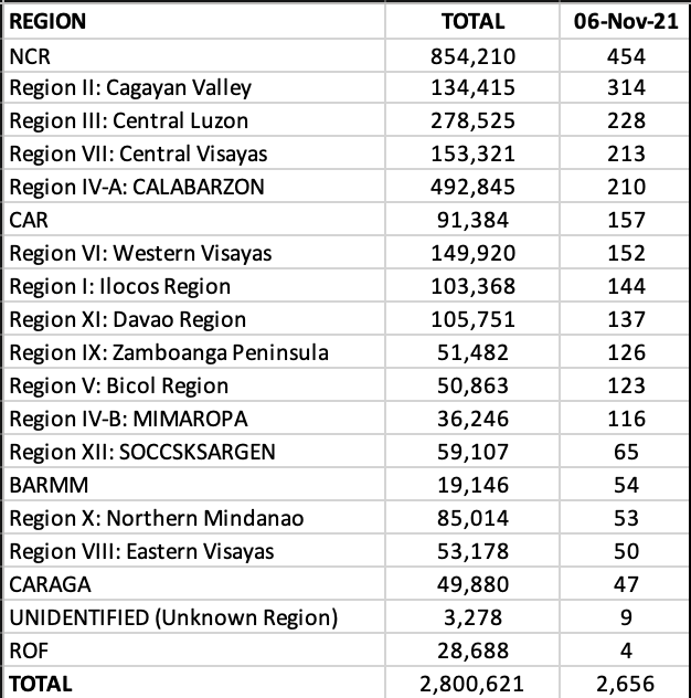 While NCR continued to lead among regions with 454 (17%) new cases today, it was Cagayan Valley who saw an increase as the delayed reports from that region came in today. Central Luzon, Central Visayas and CALABARZON reported more than 200 cases.