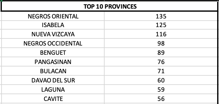 On a provincial level, Negros Oriental led the pack, with 4 provinces in Northern Luzon in the top 10. The are: Isabela, Nueva Vizcaya, Benguet and Pangasinan.
