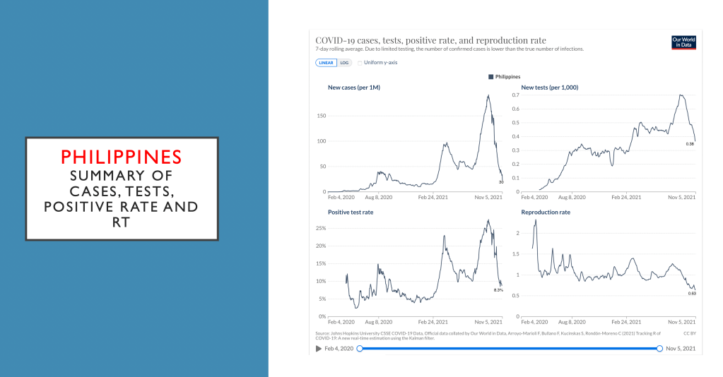 The infographic below shows the over-all status of the Philippines in the Delta surge. Cases have dropped and while testing has declined, so has positivity test rate. Even the reproduction rate is at an all time low at 0.63 (+/- 0.05).