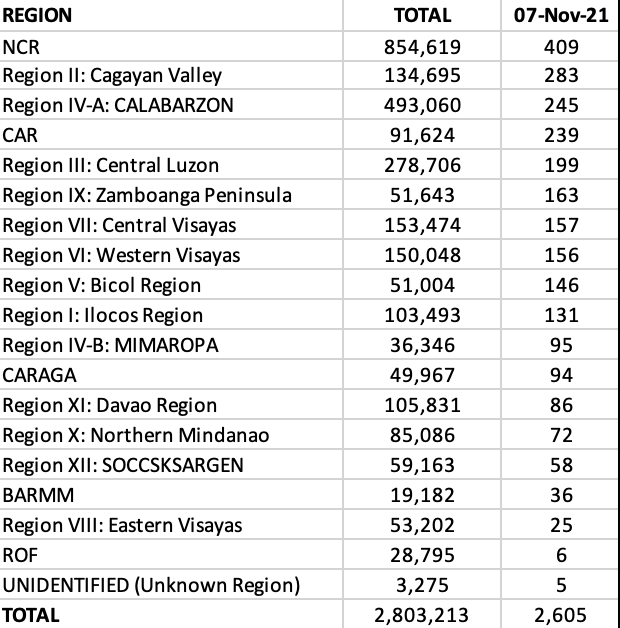 The weekend ends with 2,605 new cases announced by the Health Agency based on 48.450 tests done last November 5 with a 5.2% positivity rate. This puts us a few cases lower than the previous day. With slightly more recoveries than cases, the active cases are down to a little more than 33,000.