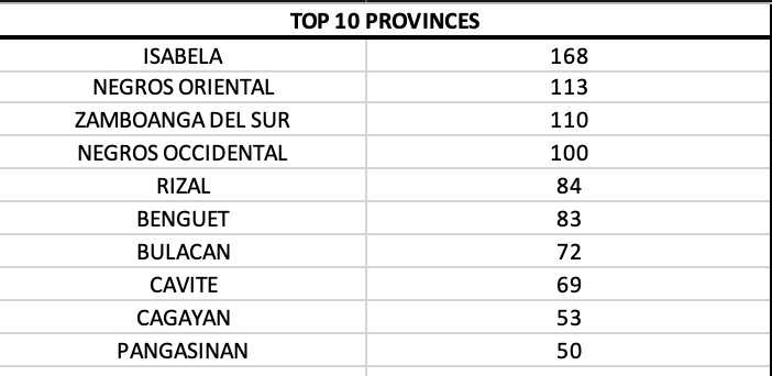 Isabela had the highest cases on a provincial level. Three other provinces reported triple digits – Negros Oriental, Davao del Sur, and Negros Occidental.