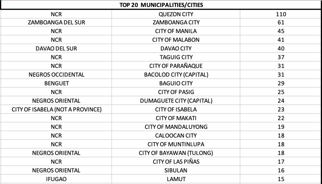 While among LGUs, Quezon City was on top with 110 cases and accounted for more than 25% of the total cases in Mega Manila. Which meant that for every case in NCR, one was from QC. Eleven of 17 LGUs in the NCR were in the top 20 list as the fewest number of cases today was 15. Which meant that if you LGU had 15 cases, it would be in the list.