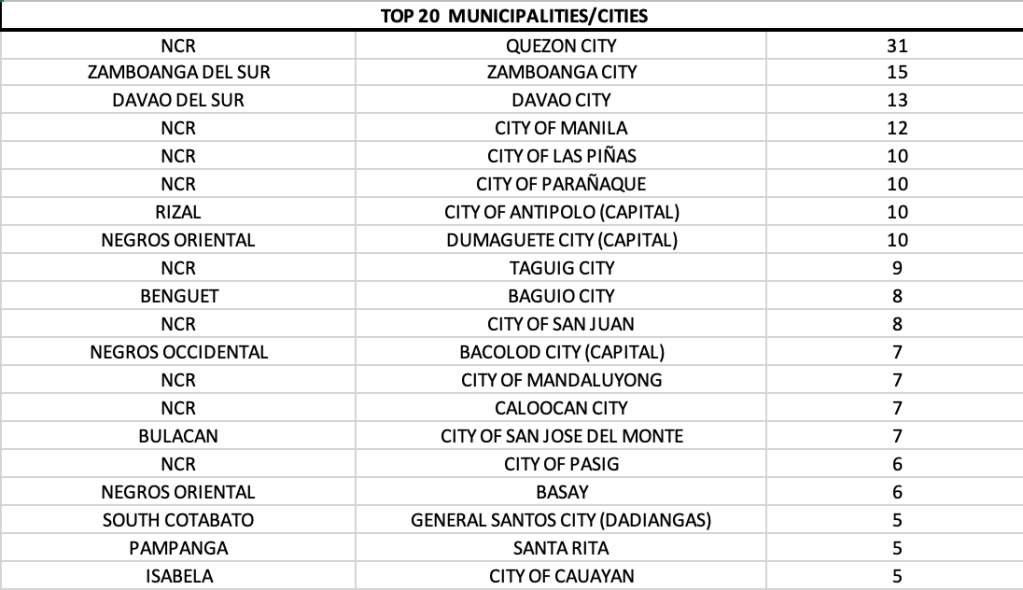 Among LGUs, it is Quezon City that reports the most cases with 31 new cases. All other LGUs report 15 or less cases, with 5 cases as the fewest number for an LGU to be included in the top 20 list.