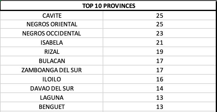 CALABARZON ranked second among regions, with Cavite leading the top ten provinces together with Negros Oriental. All provinces reported 25 cases or less, on a day with very low positive patients.