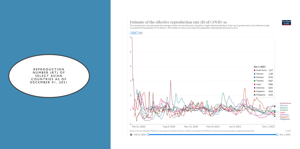 Reproduction number in the same select countries shows that the Philippines is continuing the declining trajectory (but I feel it will plateau around this point soon), as it has the lowest reproduction number among these select nations. Note that South Korea and Vietnam continue to have R>1.0 as the former sees its highest cases since the beginning of the pandemic with more than 5,000 cases/day. Singapore has significantly and rapidly slowed down the reproduction number as the cases drop to 700 plus within a month from seeing more than 2,000 new daily cases. But that should not be a difficult task for Singapore because the country of less than 6M people have more than 90% vaccinated (>85% fully) and are able to manage the cases because of the smaller population size.