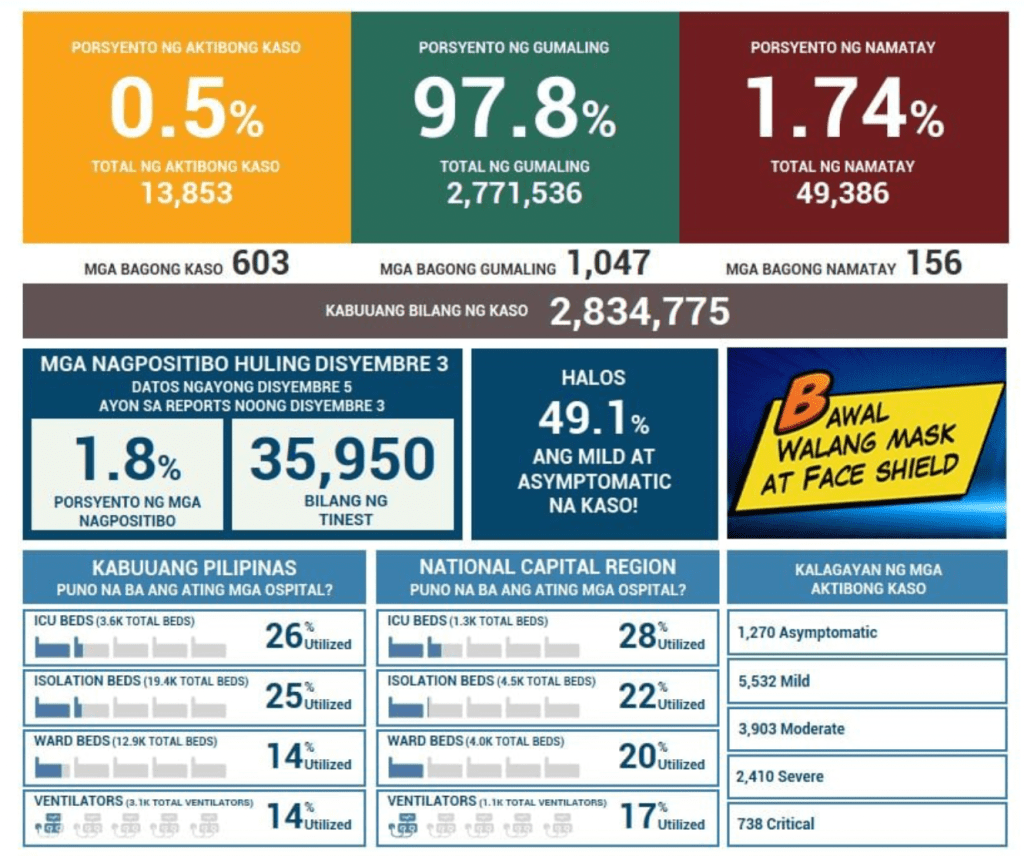 The Health Agency reports 603 new cases based on 35,950 tests done last December 3 with 1.8% positivity rate. The active cases are now less than 14,000 but more than half of them are moderate to critically ill.