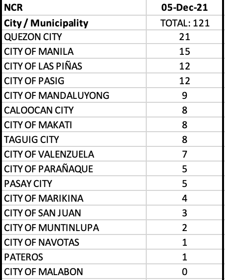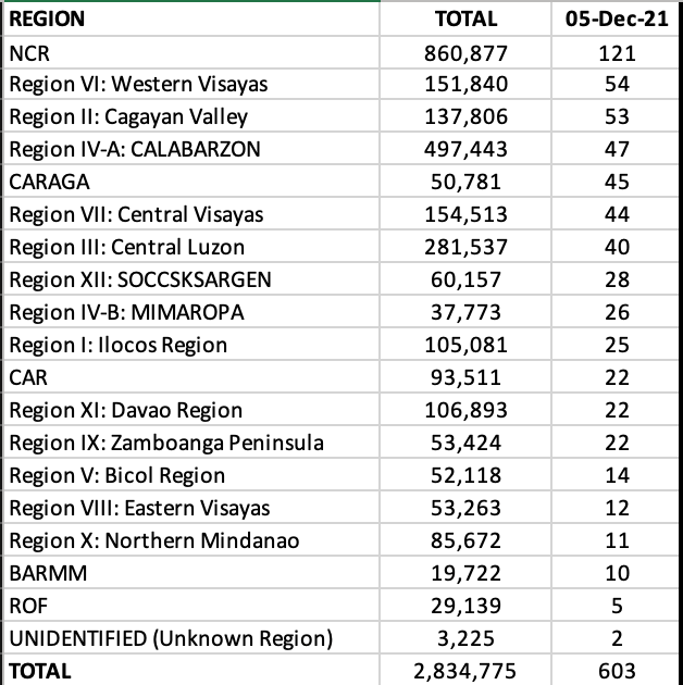 NCR had 121 cases today or 20% of the total cases in the country. Western Visayas and Cagayan Valley reported more than 50 cases apiece.