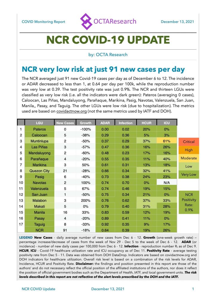 All 17 LGUs in the NCR are at either low or very low risk. Only the cities of Muntinlupa, Quezon City, Malabon and Makati are at low risk, while the rest are at very low risk. This is because while the cases in Muntinlupa City average 2/day and continues to have a decrease in growth, an ADAR of 0.37 and an R of 0.29, its health care utilization rate is at 37% and the ICU rate is moderate at 61%. The hospital that leads in the ICU rate based on the website of the Department of Health is Ospital ng Muntinlupa. Strangely, Ospital ng Muntilupa has a 66.7% occupancy for their ICU (8 of 12), yet NONE of the patients in the hospital are moderate to critical. COVID-19 suspects are admitted to the ICU in Ospital ng Muntinlupa.