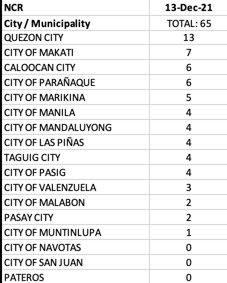In NCR, only Quezon City had double digit cases with all the remaining cities reporting single digit cases and three LGUs having ZERO covid. They latter are: Navotas, San Juan, and Pateros.