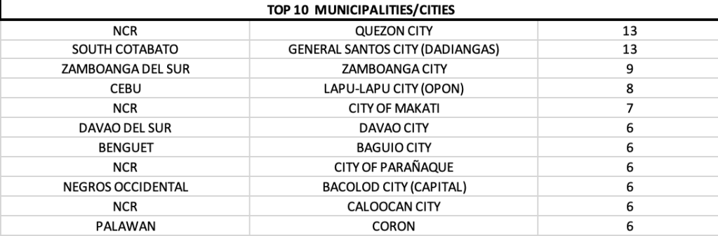 On an LGU level, Quezon City and General Santos were the only ones with double digit cases at 13 apiece. All other LGUs report single digit with 6 cases as the fewest in the top TEN list.