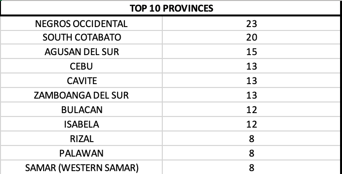 Among provinces, Negros Occidental led with 23 cases while all the rest had 20 cases or less.