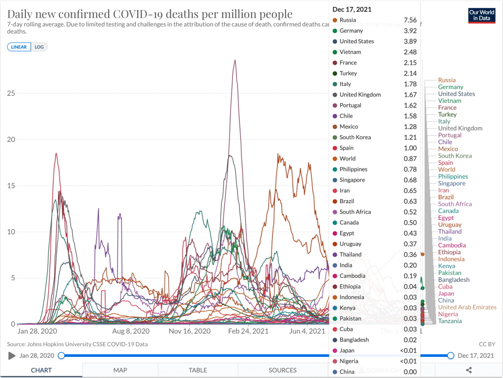 The graph below shows the daily new cases per capita (per million population) in the world. If you look closely, the world is averaging at least 80 new daily cases per million. But it is the European countries and the UK that is leading the pack with a trajectory unseen from last year. UK hits almost 1,000 new cases per million population or 1 in every 1,000 people have COVID-19 every day. France, Spain, Germany and Portugal – all countries in Europe – round up the top five countries in the world with most daily cases per capita. The surge in these areas pale compare to the surge that is ongoing in South Africa.
