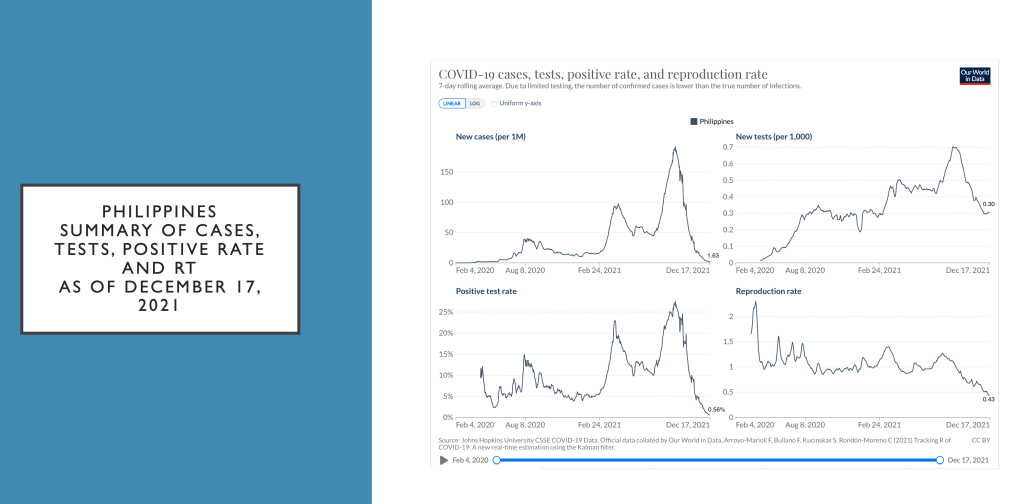 There are 203 new cases announced today by the Health Agency based on close to 29,000 tests with a positivity rate of 0.8% last December 17. The active cases remain at four digits (but can truly be lower if the Health Agency is able to resolve the backlog in cases. Notice that among the active cases, close to 58% are moderate to severe. Many of these were from 2020 to October 2021.)