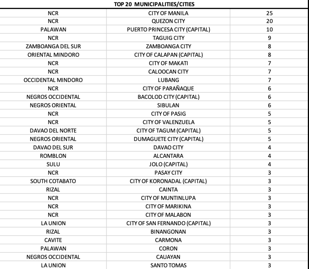 Among LGUs, it was the City of Manila that stole the thunder from erstwhile leader Quezon City with 25 cases with the former and 20 in the latter. Puerto Princesa was the only other LGU with double digit cases at 10. All other LGUs in the top 20 saw single digit cases, with 3 being the lowest number in the list.
