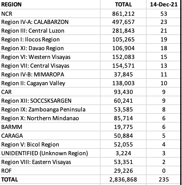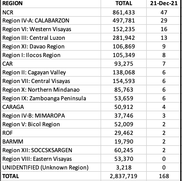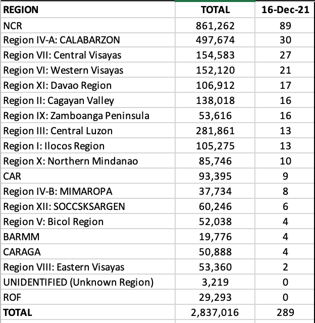 The Health Agency reports 168 new cases (an all time low even during the beginning of the pandemic), with close to 23,000 tests done and 0.9% positivity last December 19. There are backlogs, which were not included in todays report. There is a very slow reconciliation of the status of the remaining 9,384 cases as close to 60% belong to the moderate to critical category. This is not in congruence with the data on ICU utilization in both the NCR and nationally.