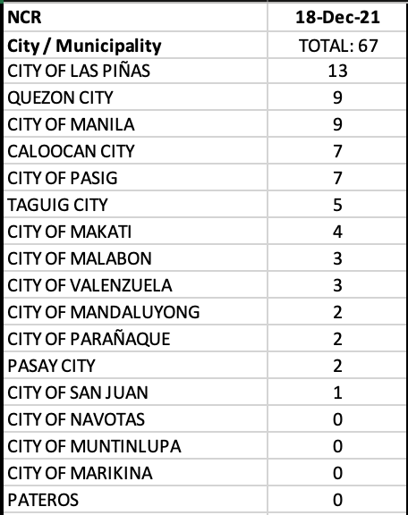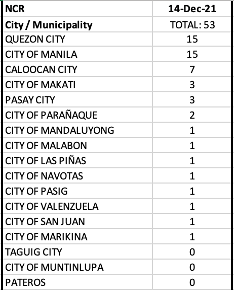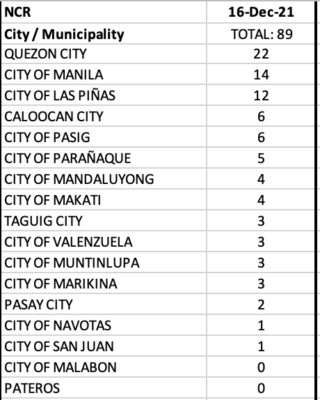 In NCR, only Quezon City had double digit cases with all the remaining cities reporting single digit cases and three LGUs having ZERO covid. They latter are: Navotas, San Juan, and Pateros.