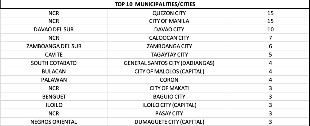 With lowering cases, beginning this issue, the LGU will feature only the top 10 for the day. Other presentations – by region, NCR and by province will remain the same.