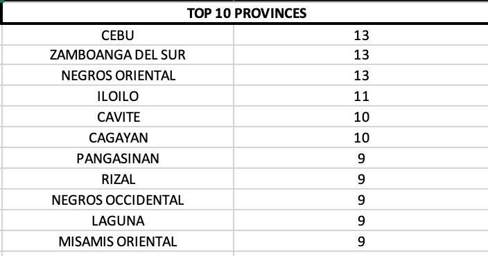 Even on a provincial level, only three provinces report double digits, led by Zamboanga del Sur, Cavite and Rizal. The fewest cases among the top ten provinces had only 4 cases reported.