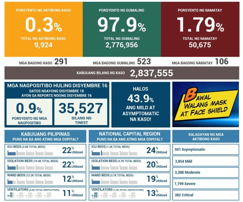 The Health Agency reports 289 new cases today based on more than 37,000 tests done last December 14 with a positivity rate of 0.9%. There has been some discrepancies in the past few days and we should see a correction in the number of new cases, hopefully within the week. As the number of recoveries are minimal, the number of active cases remain above 10,000. The moderate to critically ill are more than 56% now.