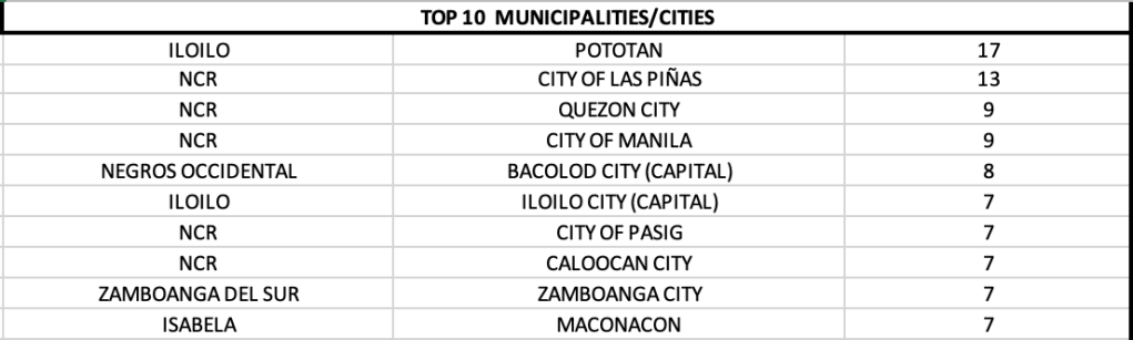 On a provincial level, it was Lanao del Norte that led the pack with 24 cases. Iligan City topped the LGUs with 22 cases and was the only LGU that had more than 20 cases. Three provinces had double digits, including Zamboanga del Sur and Iloilo. Three LGUs also had double digits, with Quezon City and Zamboanga City added to this list.