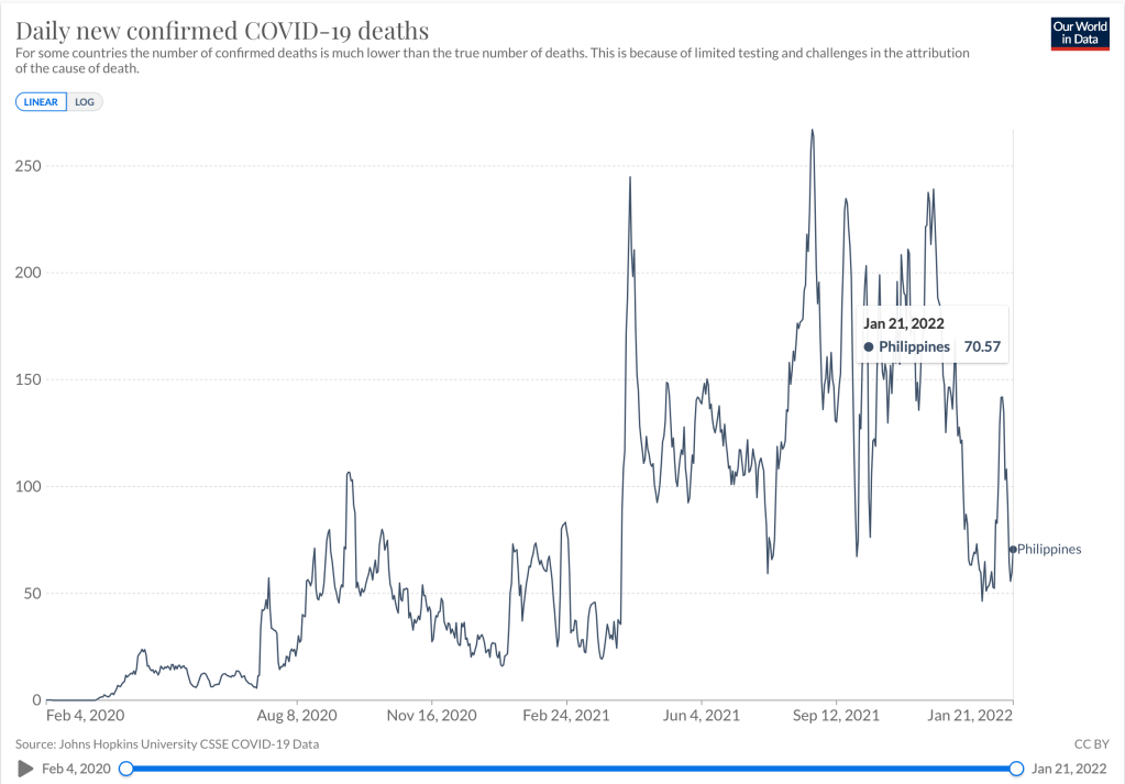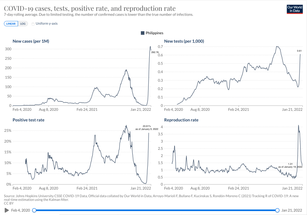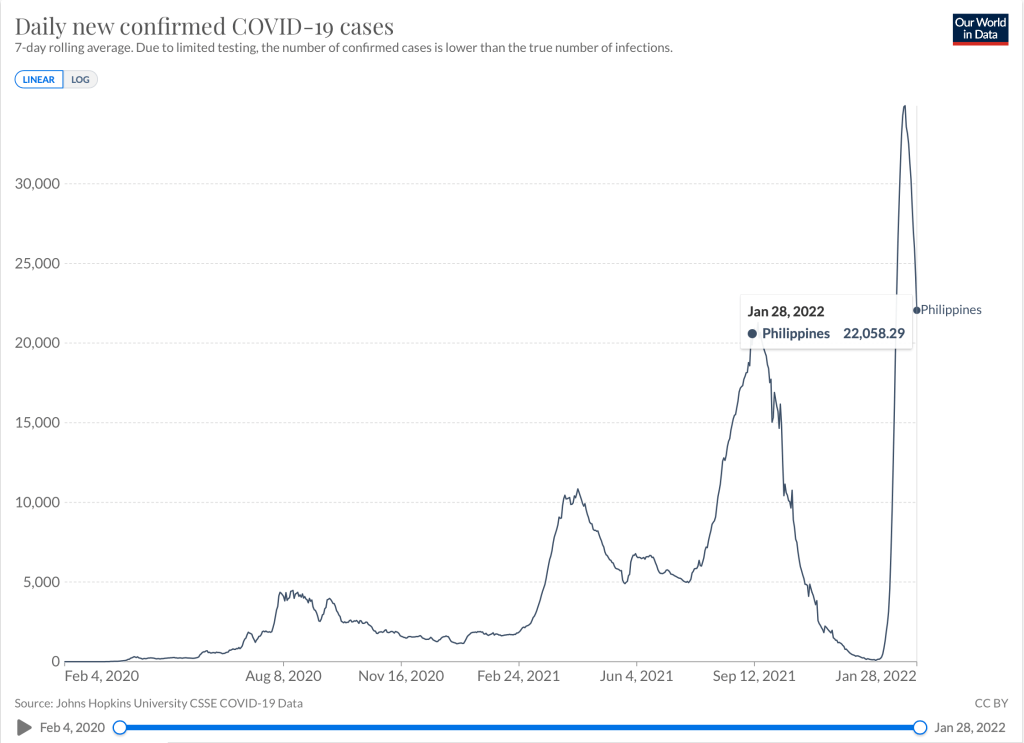 In the Philippines, as the needle rise of cases, the 7-day average of cases drop to 22000. While this is an under report (the country only counts cases with RT-PCR results from accredited laboratories, while Rapid Antigen Tests both self tested and laboratory or healthcare performed are not included), it represents a good sampling size of the graph of the surge.